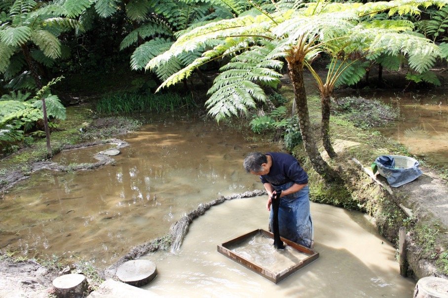 Despite this, islanders wanted to keep their handwoven tsumugi. According to legend, a housewife hid her garment in a mudfield during an inspection by officials. When she later retrieved and washed it, she found it had transformed into a beautiful, glossy black—one story of how mud dyeing began.